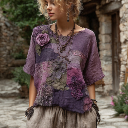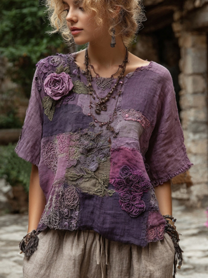 Vintage Purple Patchwork Rose Art Round Neck Loose T-shirt