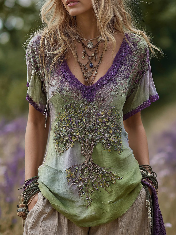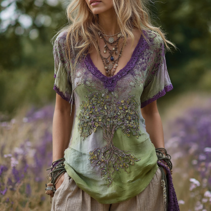 Vintage Purple Rhinestone Tree Of Life Gradient T-shirt