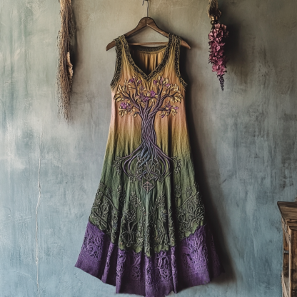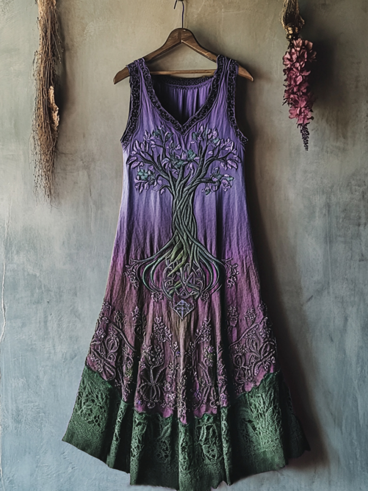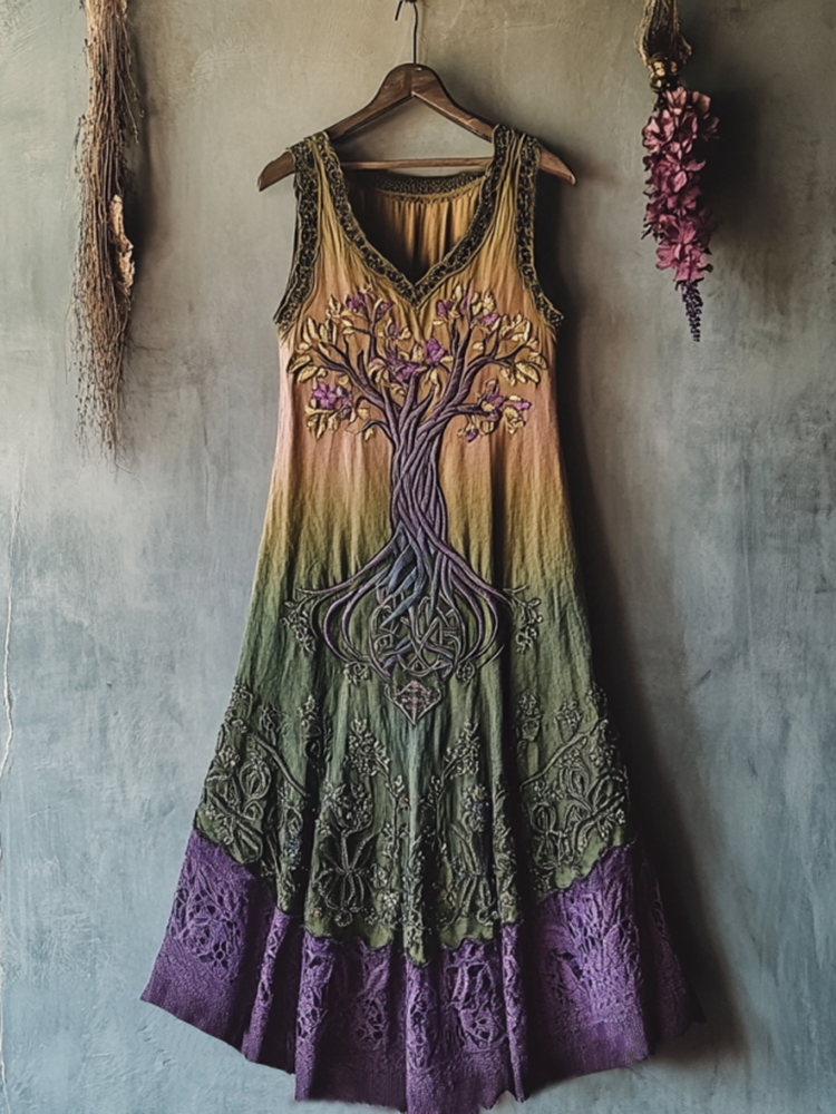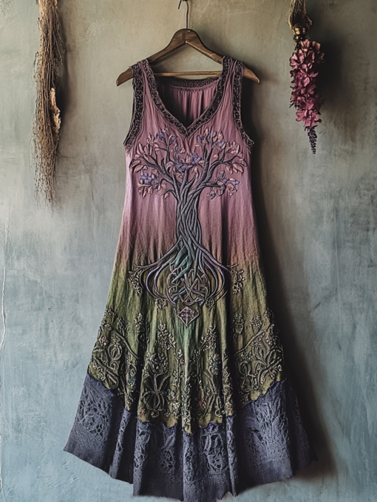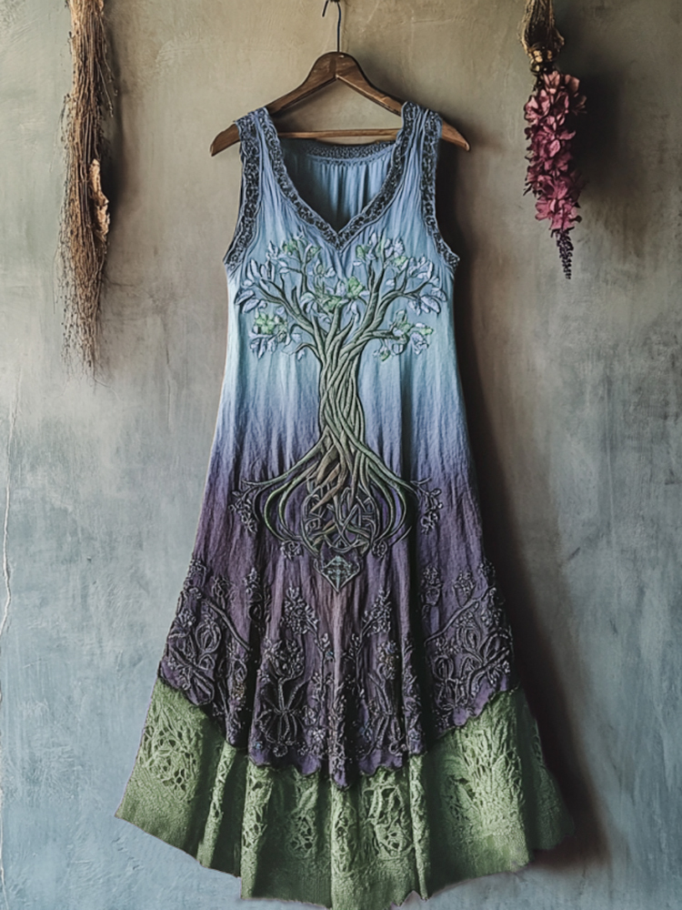 Vintage Viking Tribal Celtic Knot Life Of Tree Lace Patchwork Art Linen Tank Dress