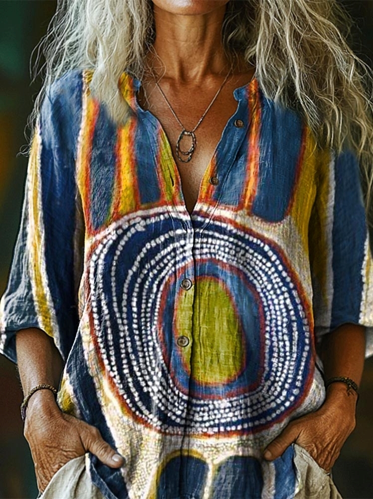 Women's Abstract Art Print Casual Cotton And Linen Shirt