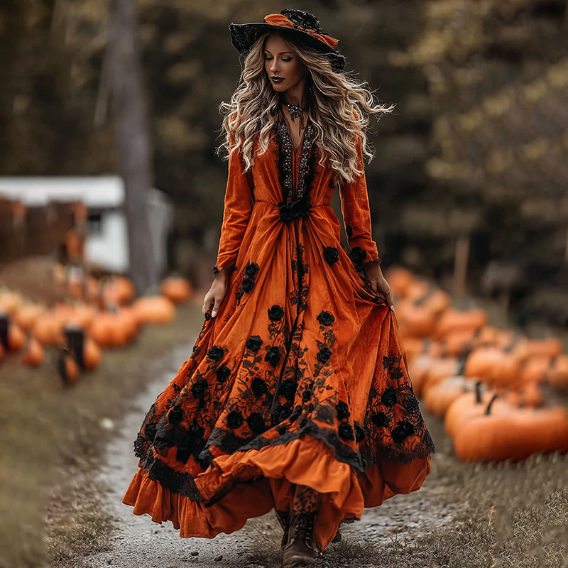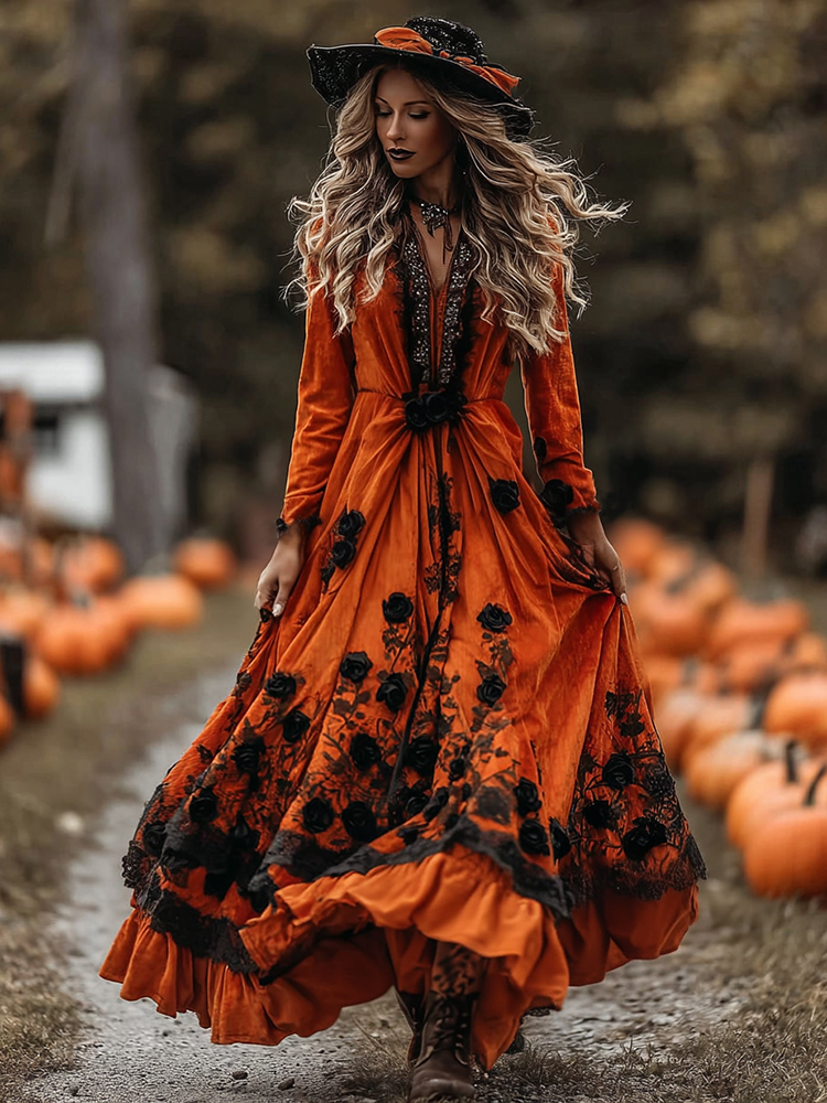 Women's Classic Halloween Black Roses Art Comfy Velvet Maxi Dress
