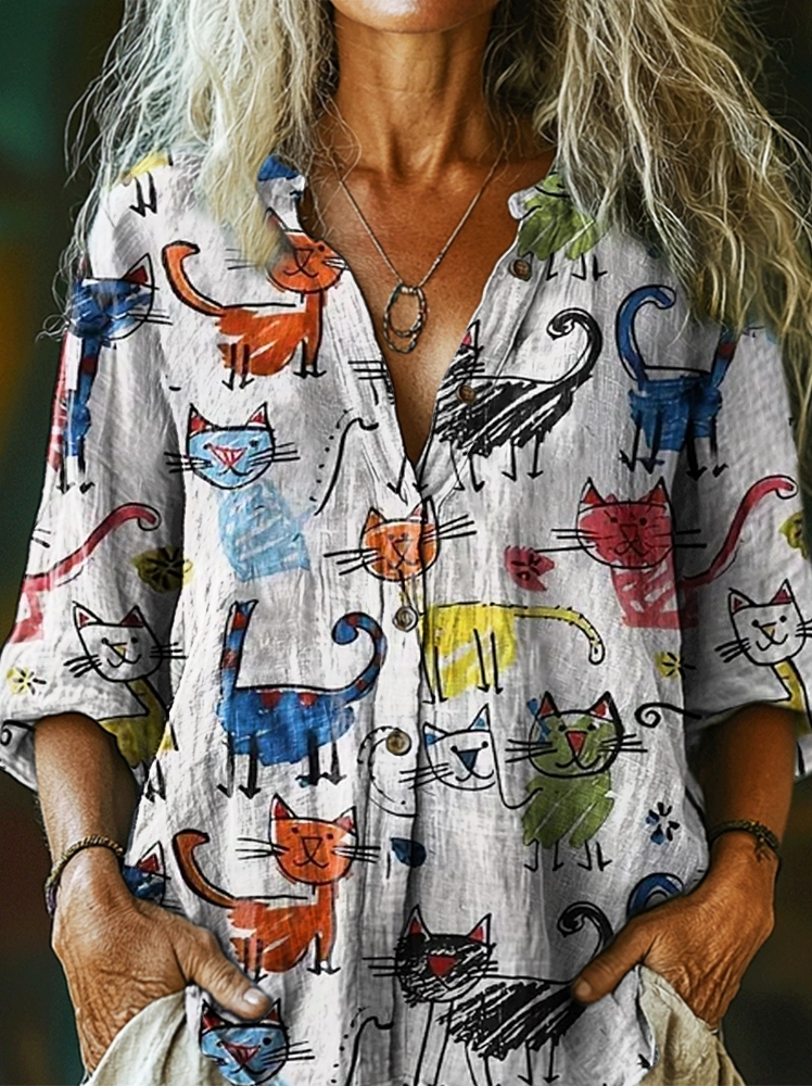 Women's Cute Animals Print Casual Cotton Linen Shirt