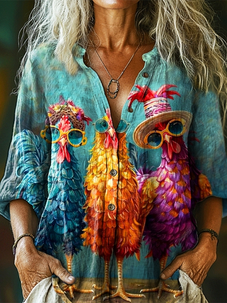 Women's Funny Rooster Art Print Casual Cotton Linen Shirt
