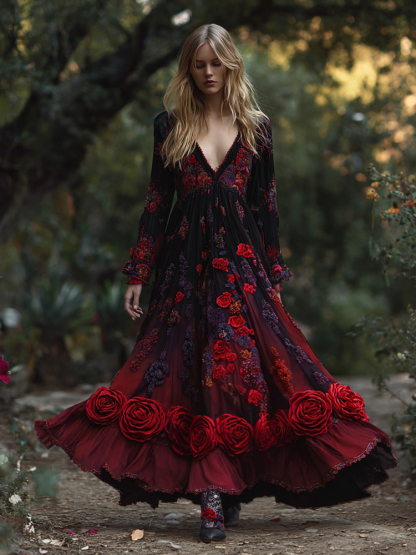 Women's Retro Red Rose Embroidery Casual Long Sleeve Dress