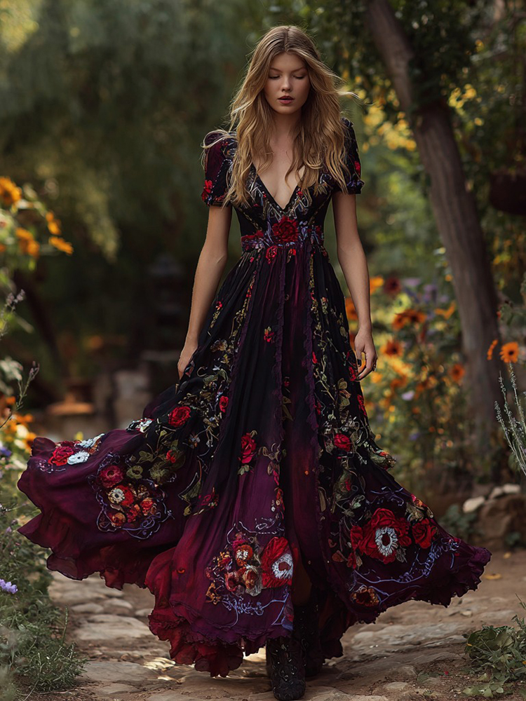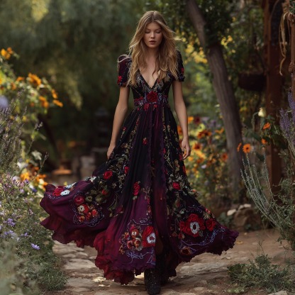 Women's Retro Red Rose Skull Embroidery Pattern Casual Short Sleeve Dress
