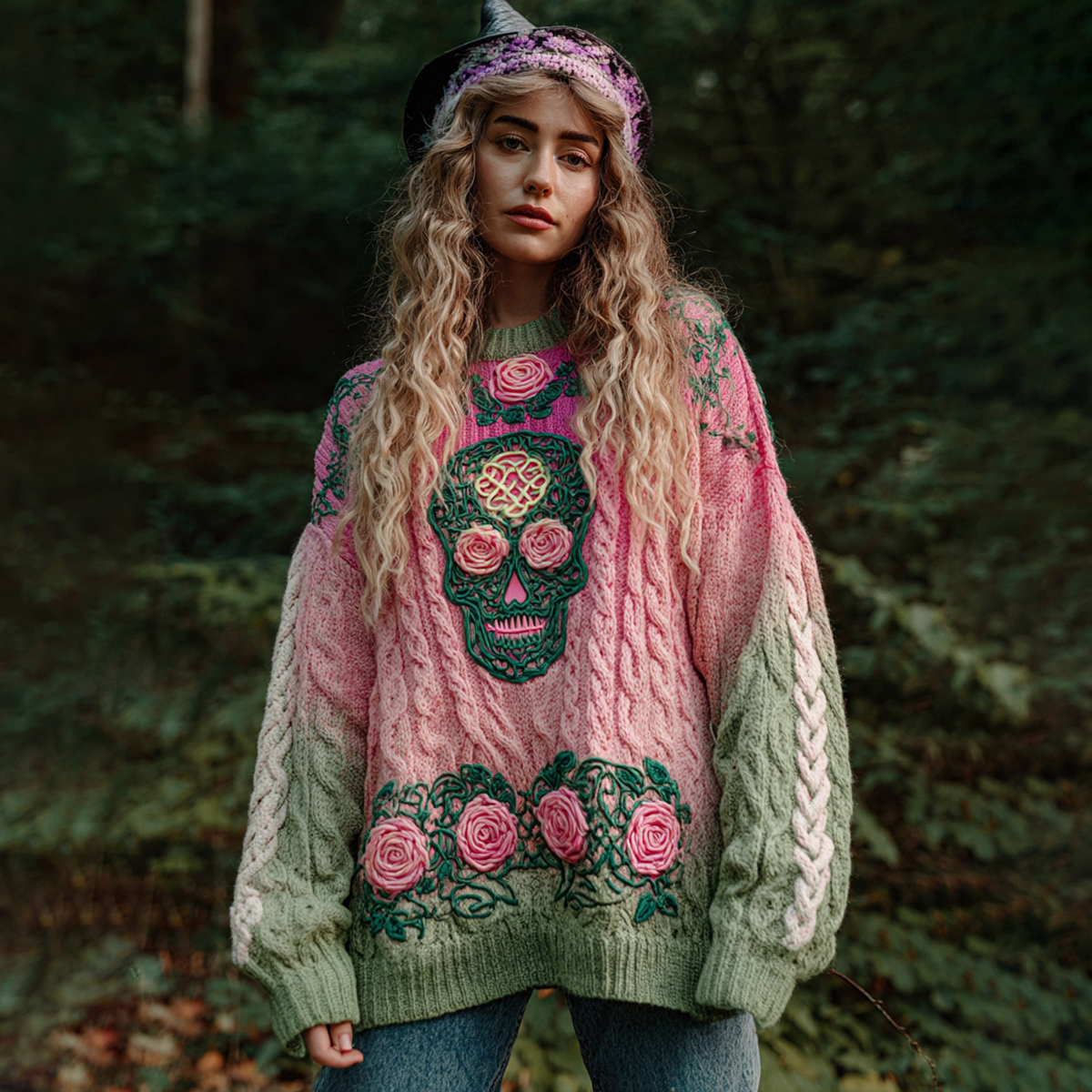 Women's Viking Tribal Jacquard Celtic With Rose And Skull Inspired Chunky Knit Round Neck Sweater
