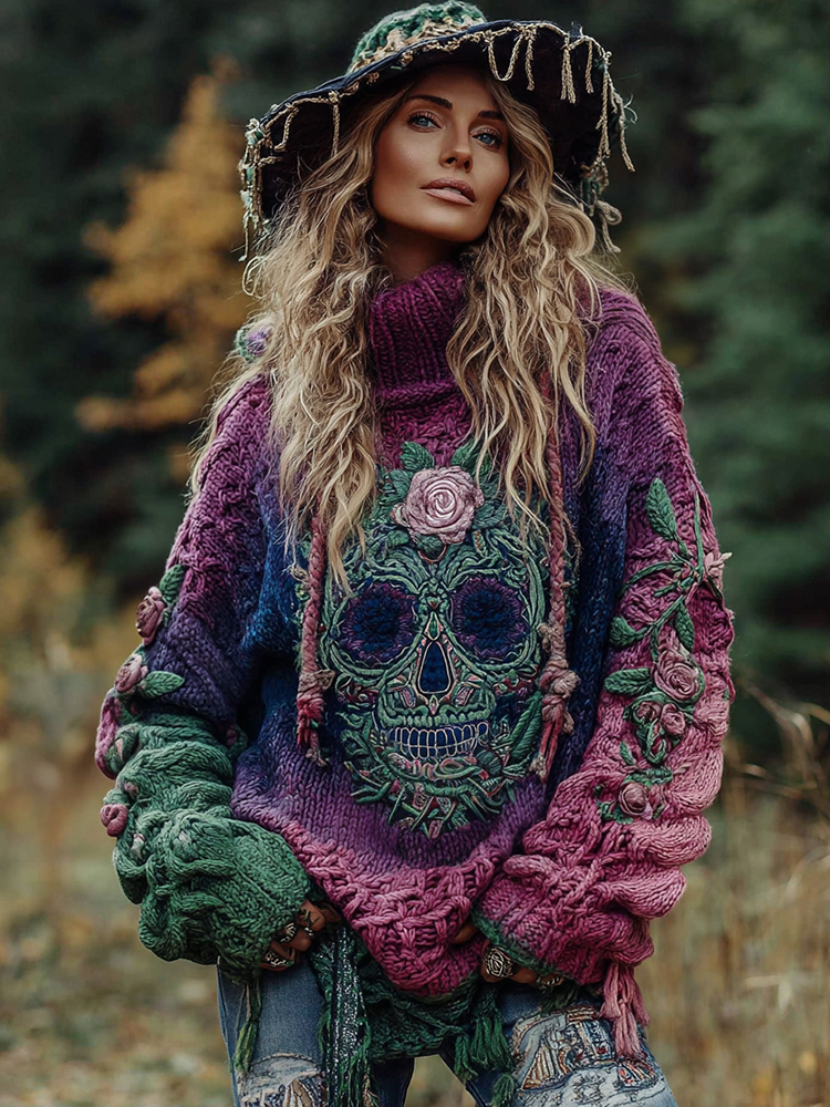 Women's Viking Tribal Jacquard Celtic With Rose And Skull Inspired Chunky Knit Turtleneck Sweater
