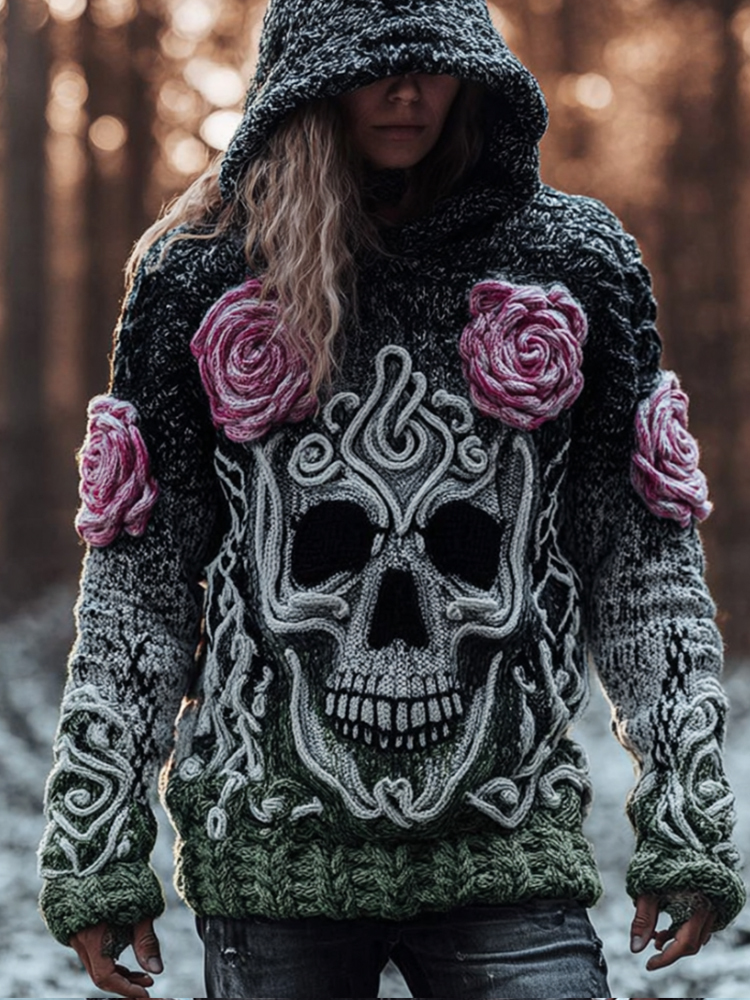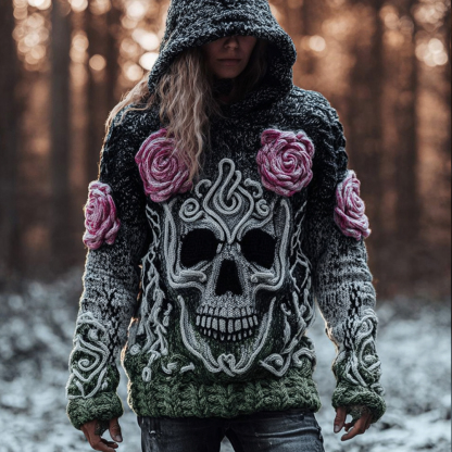 Women's Vintage Black And White Embroidered Rose Skull Hooded Sweater
