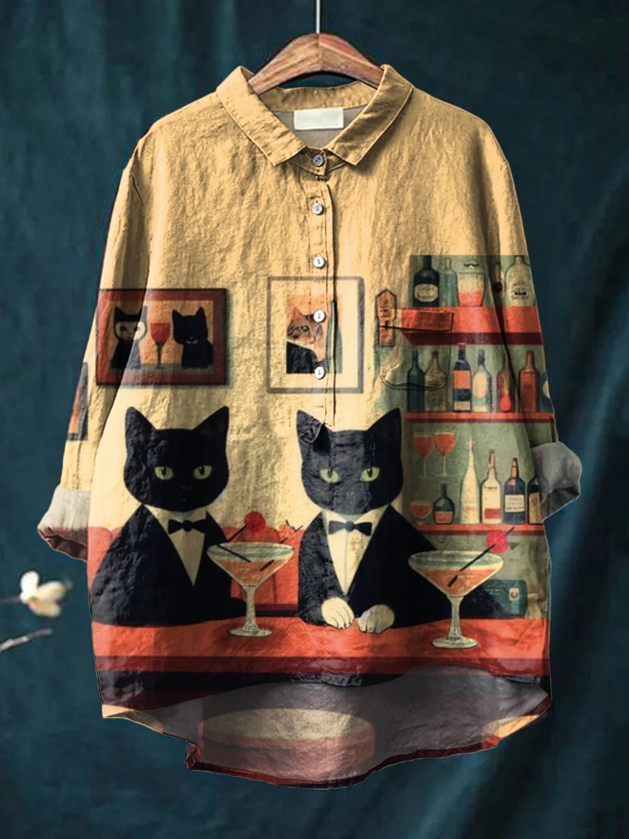 Women's Vintage Cats Drinking Cocktails Illustration Print Casual Shirt