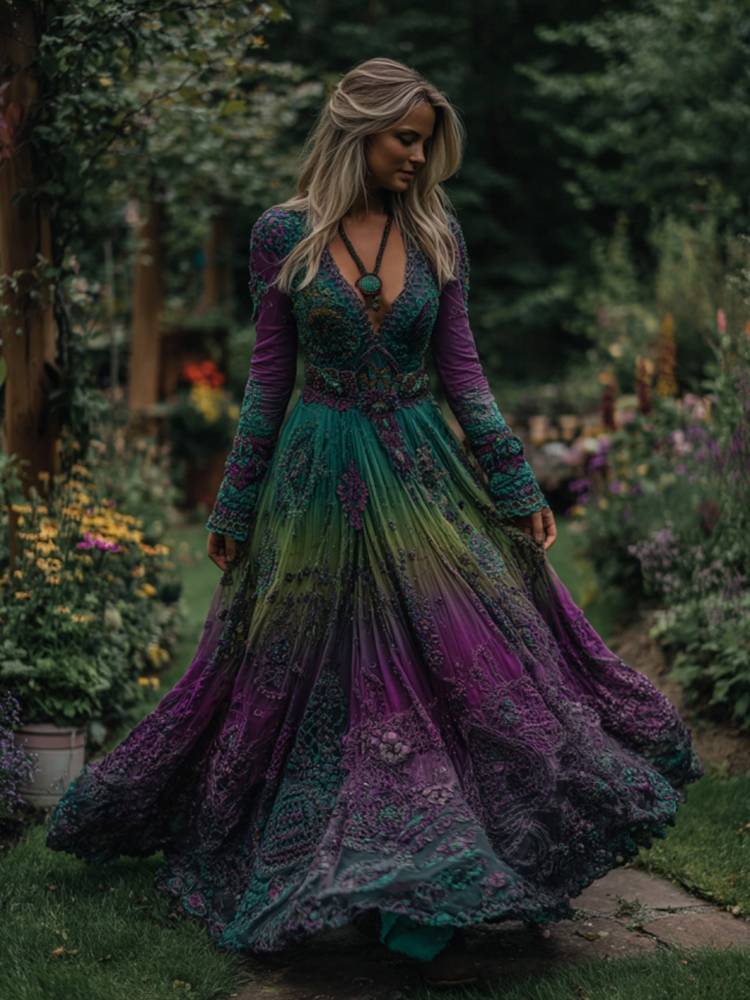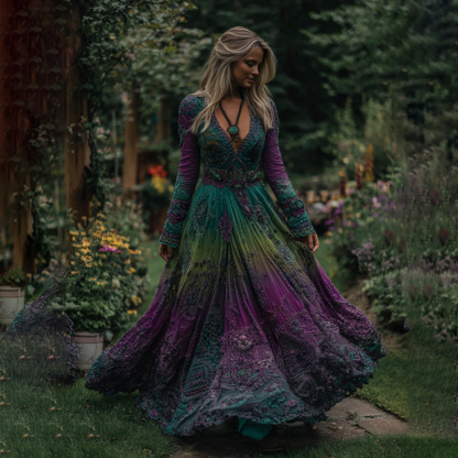 Women's Vintage Tribal Pattern Gradient Art V Neck Maxi Dress