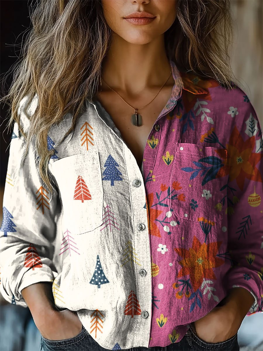 Women's Colorblock Floral Art Print Casual Long Sleeve Comfortable Cotton Shirt