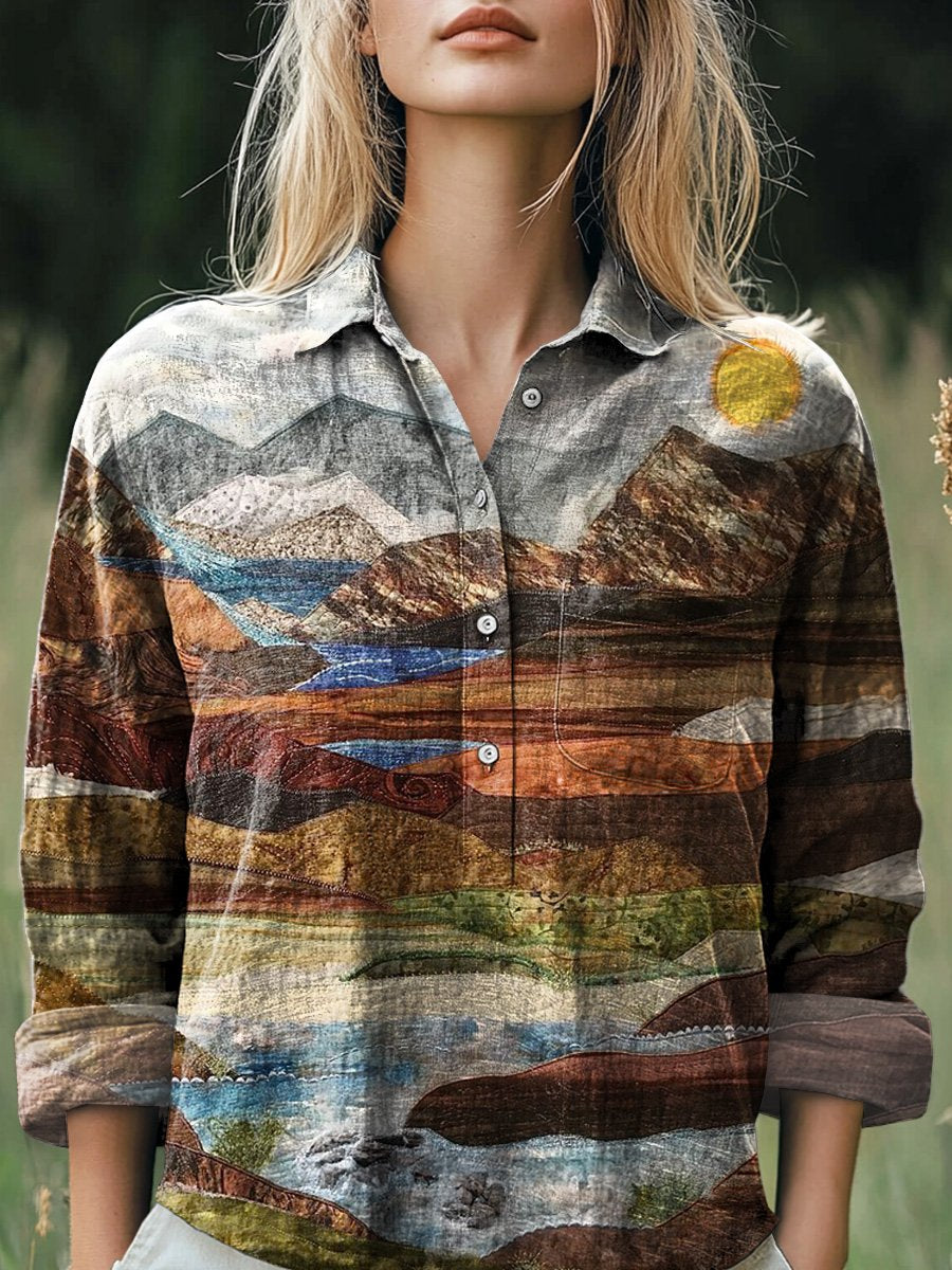 Earth Color Landscape Patchwork Art Printed Women's Casual Cotton And Linen Shirt