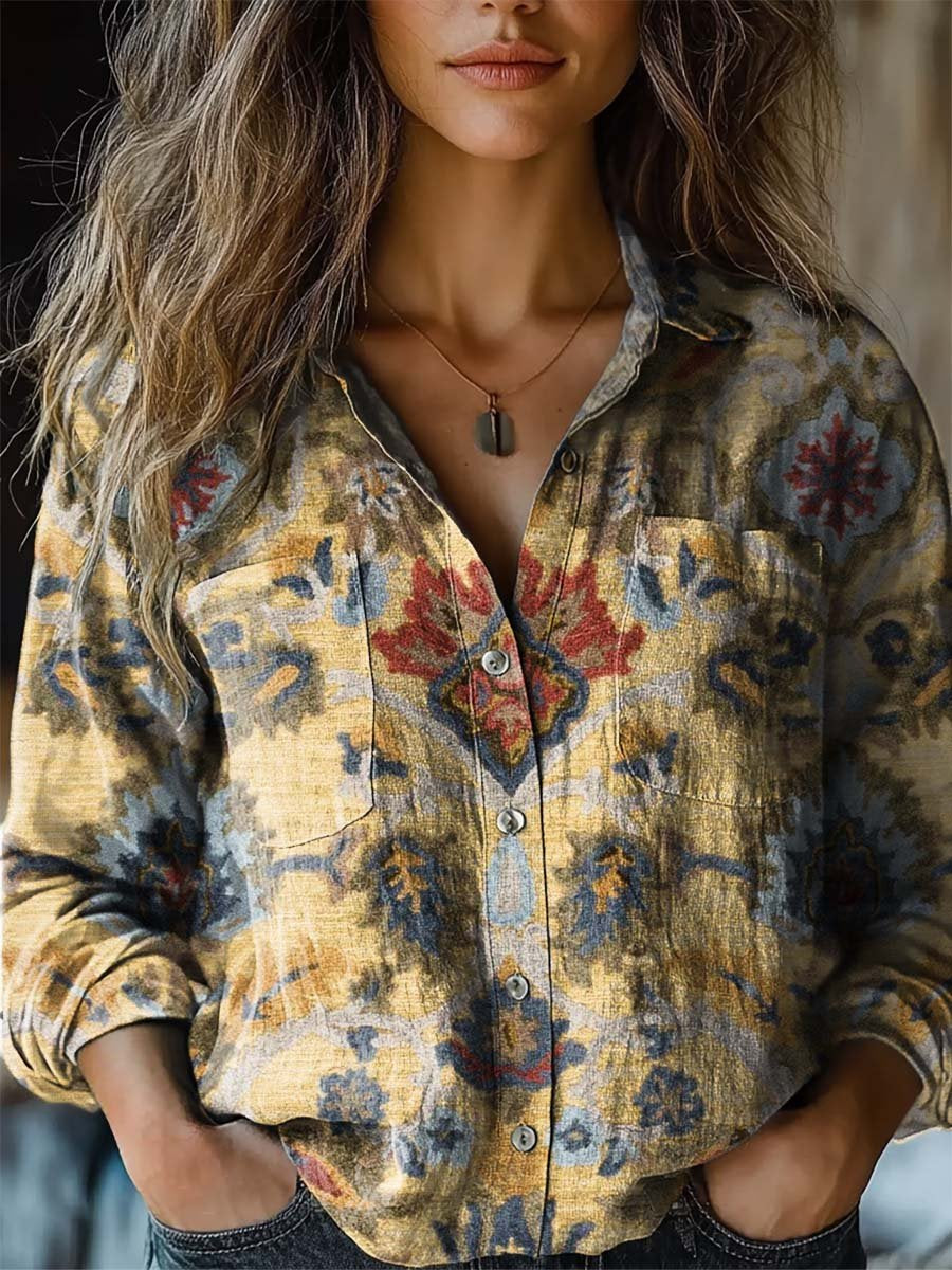 Women's Vintage Floral Art Print Casual Long Sleeve Comfortable Cotton Shirt