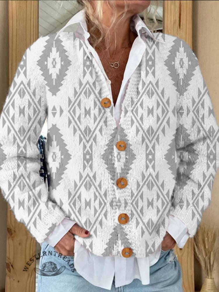 White Vintage Aztec Print Buttoned Cardigan Sweater