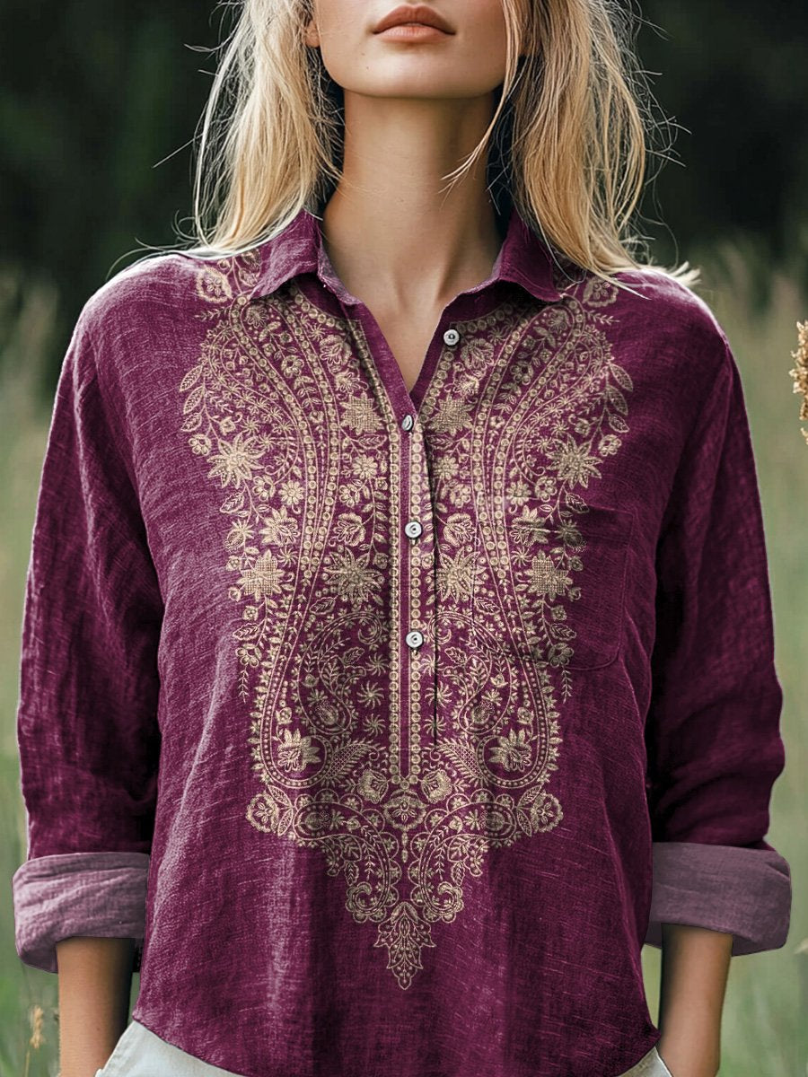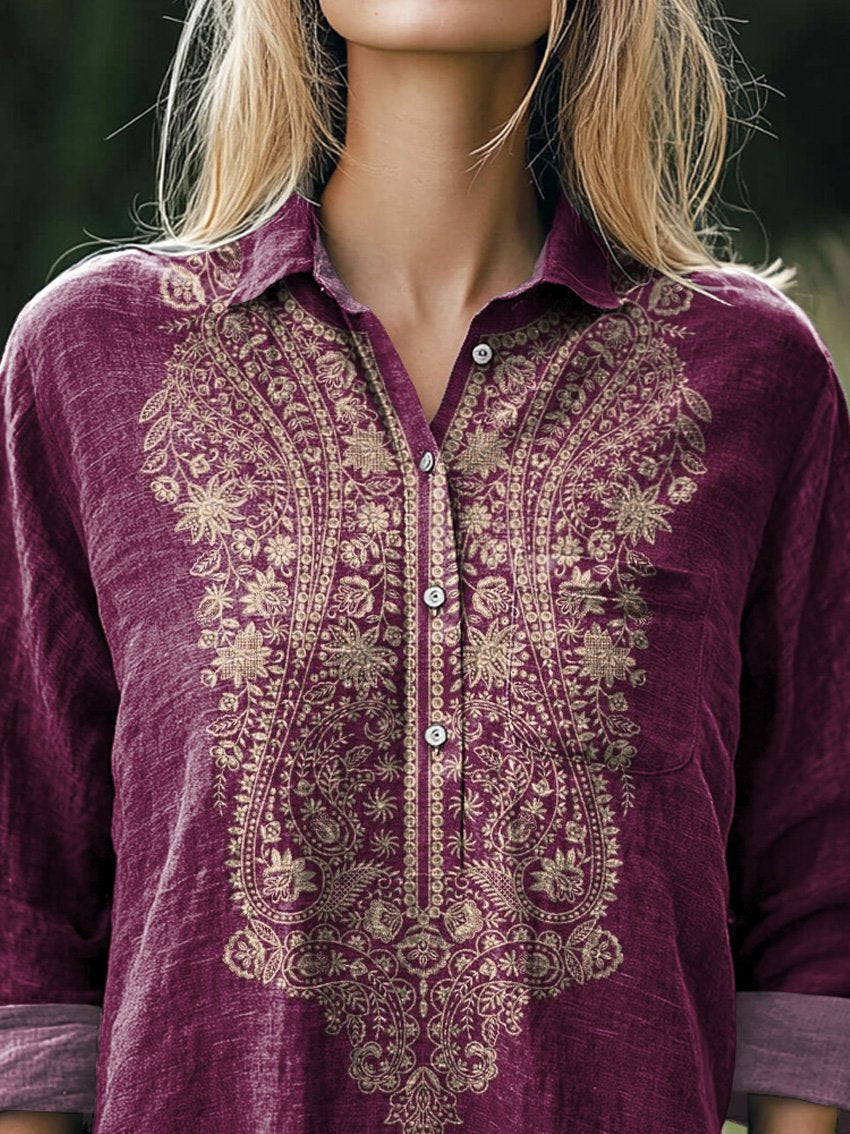 Women's Vintage Embroidered Floral Art Print Casual Long Sleeve Comfortable Cotton Shirt