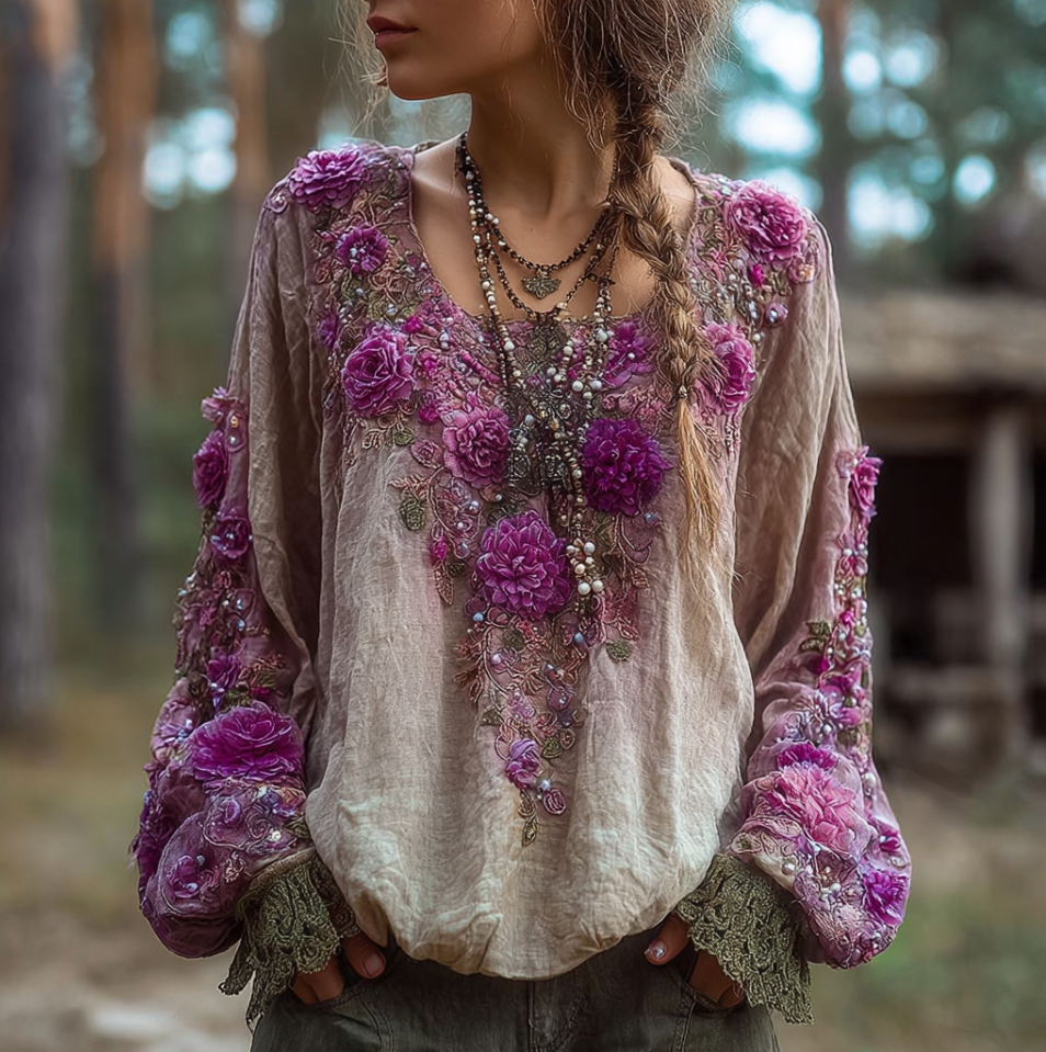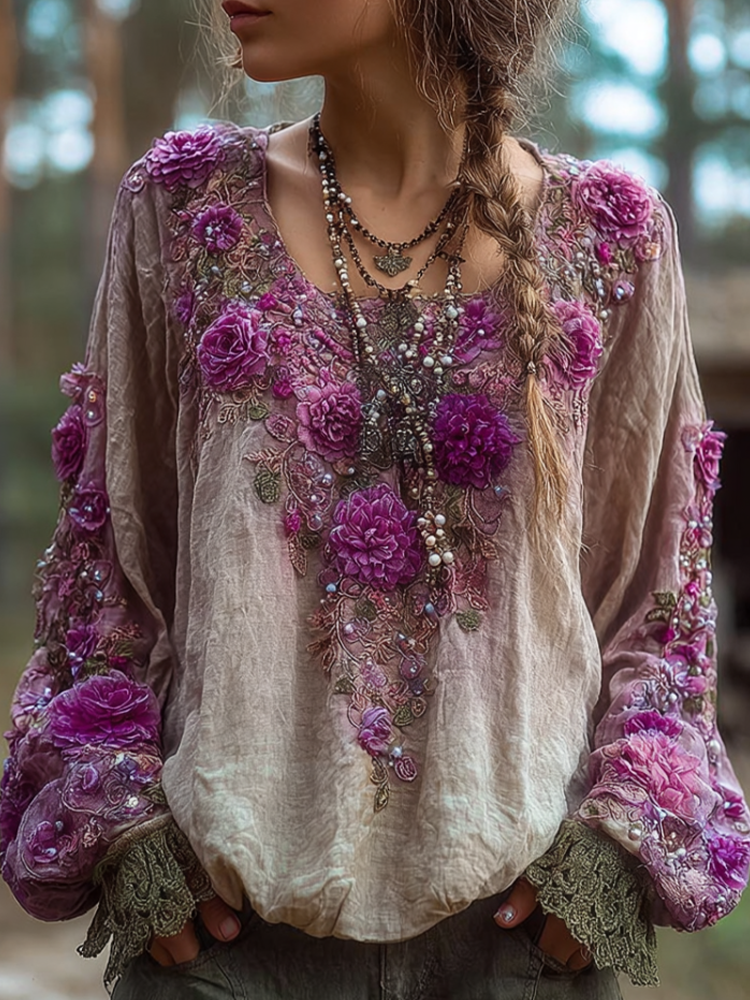 Bohemian Style Round Neck Long Sleeve 3d Purple Flower Design Cotton And Linen Top For Women