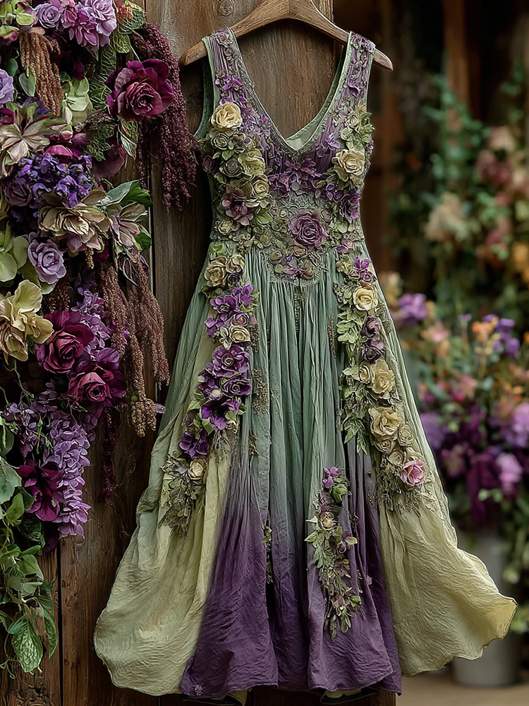 Classy Gradient Purple Lavender And Floral Embroidered Linen Tank Short Dress