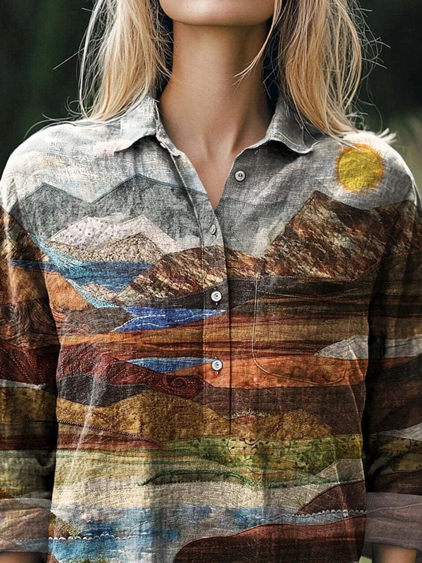 Earth Color Landscape Patchwork Art Printed Women's Casual Cotton And Linen Shirt
