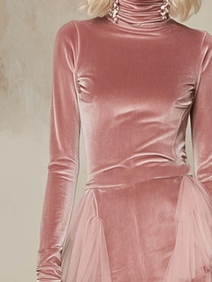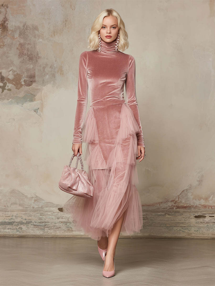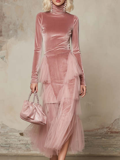 Elegant And Gentle Pink Velvet Organza Trimmed Maxi Dress