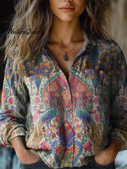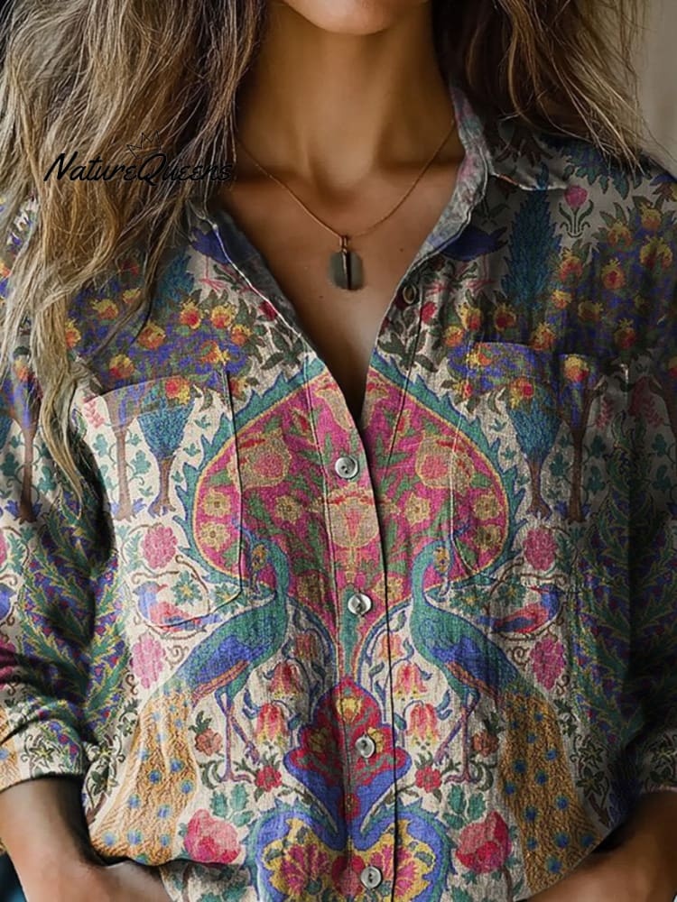 Ethnic Style Peacock Pattern Printed Women's Casual Long Sleeve Comfortable Cotton Shirt