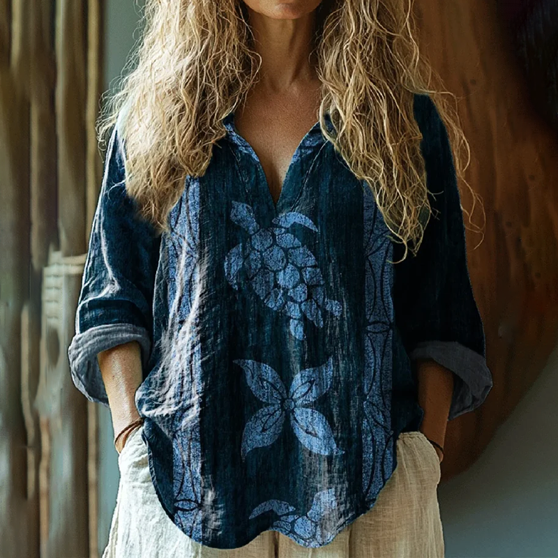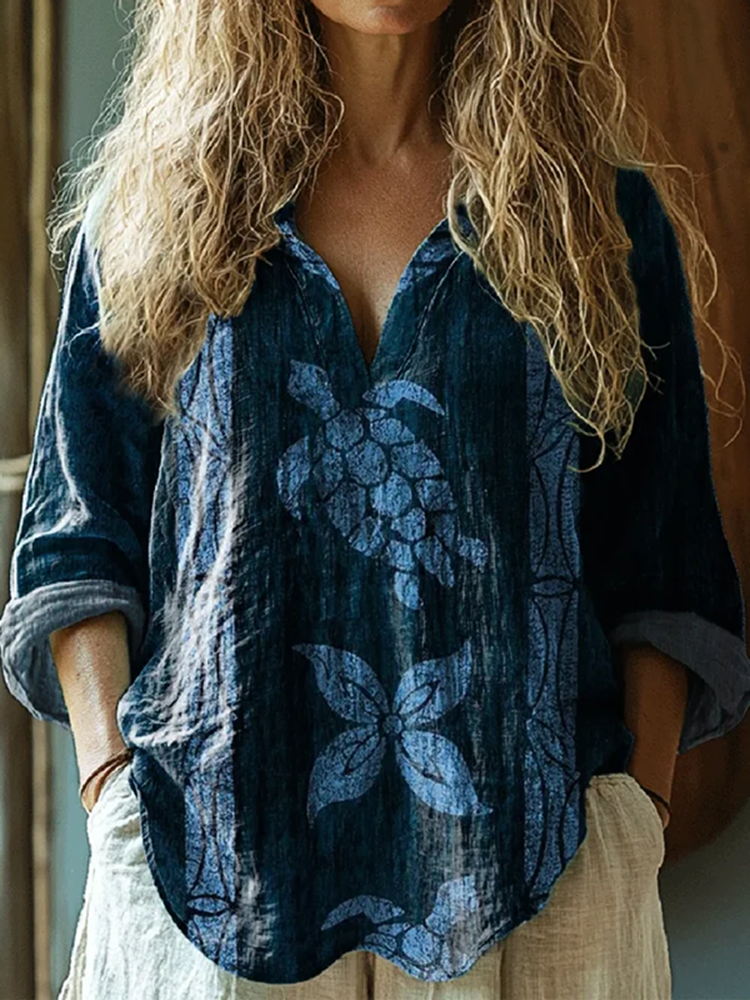 Vintage Holiday Turtle Art Linen V Neck Long Sleeve Shirt