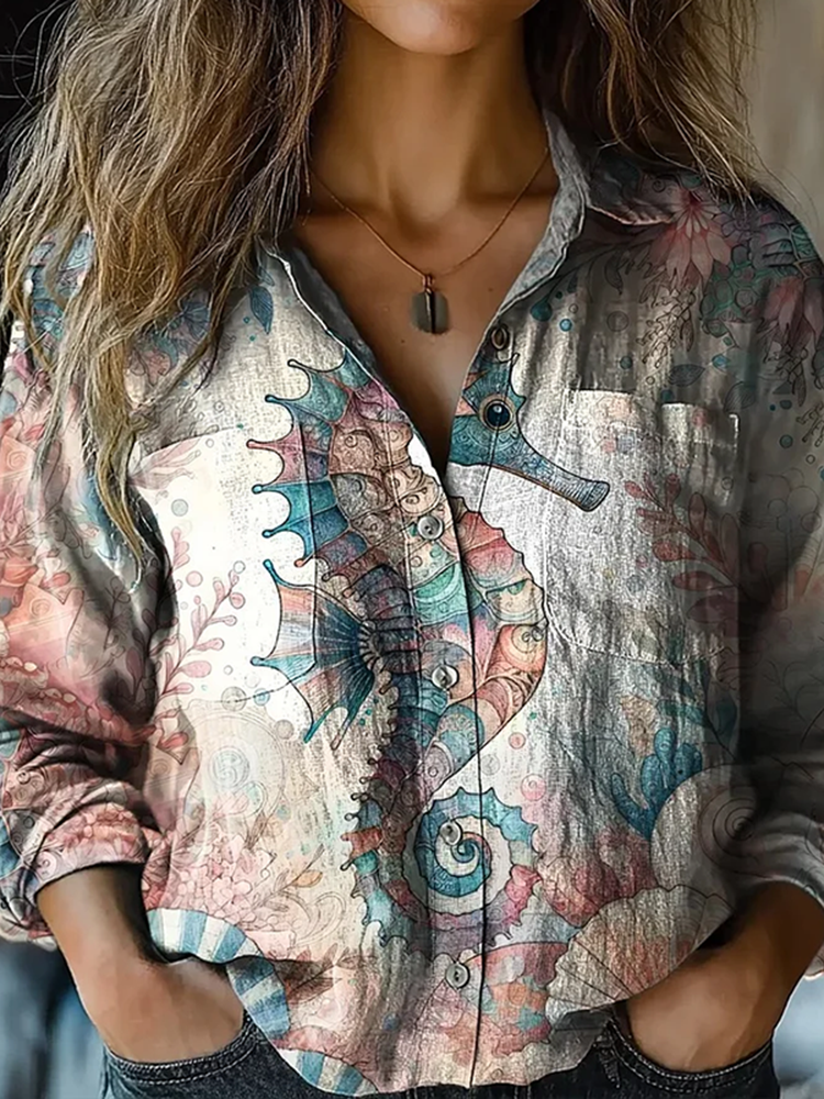 Vintage Seahorse Art Linen Print Long Sleeve Shirt