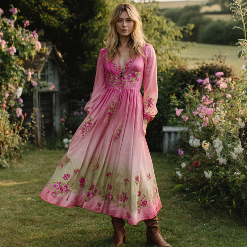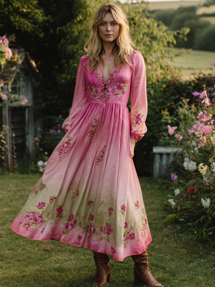 Pink Flower Embroidery V-neck Long Sleeve Maxi Dress