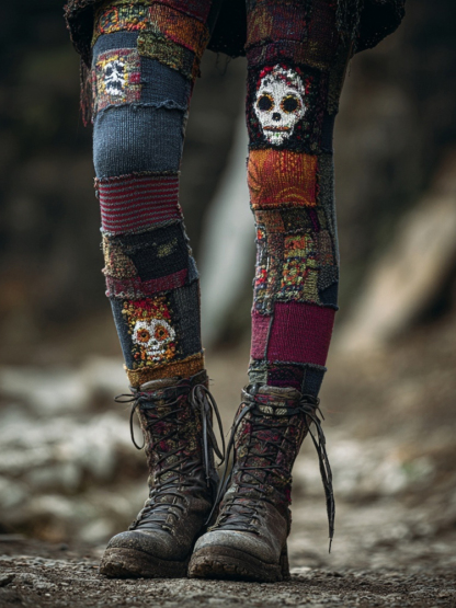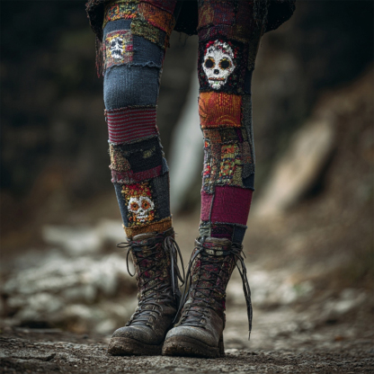 Retro Halloween Skull Washed Patchwork Cozy Knit Leggings