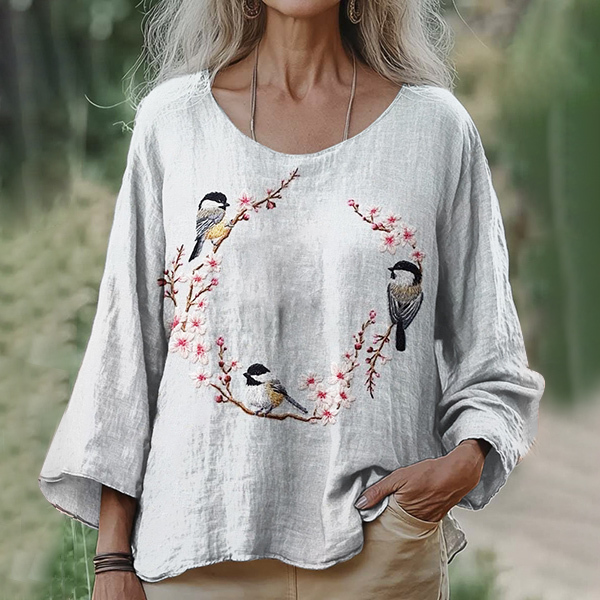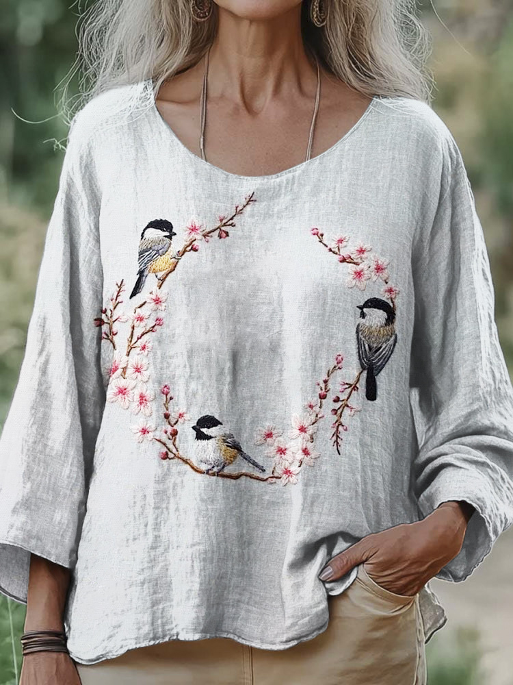 Sakura & Birds Embroidered Women's Linen Loose Shirt