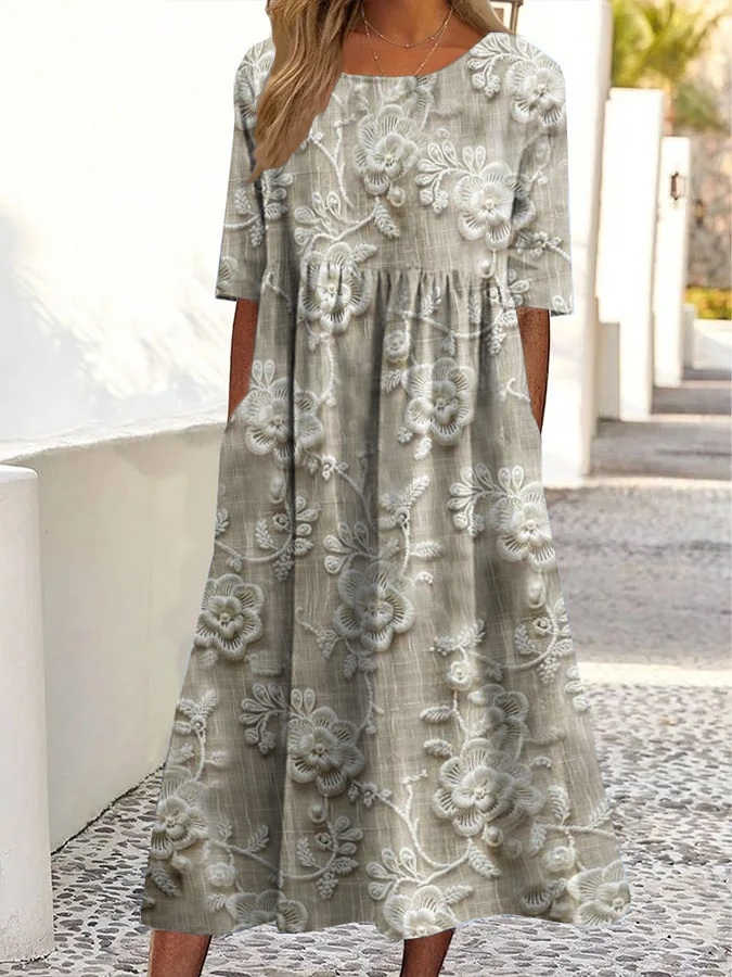 Vintage Embroidered Floral Print Crew Neck Pocket Midi Dress