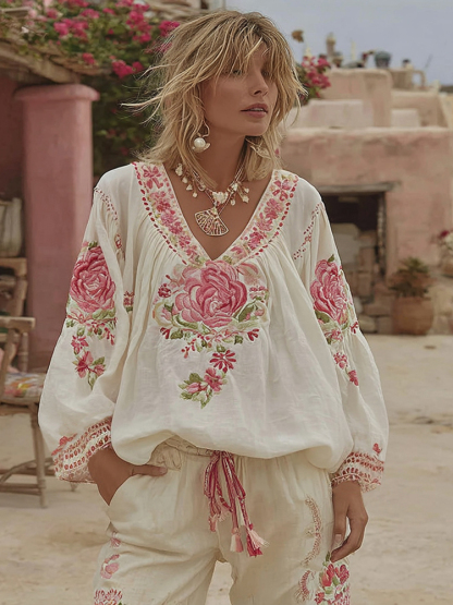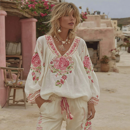 Vintage Floral Art Embroidery Linen V-neck Long Sleeves T-shirt