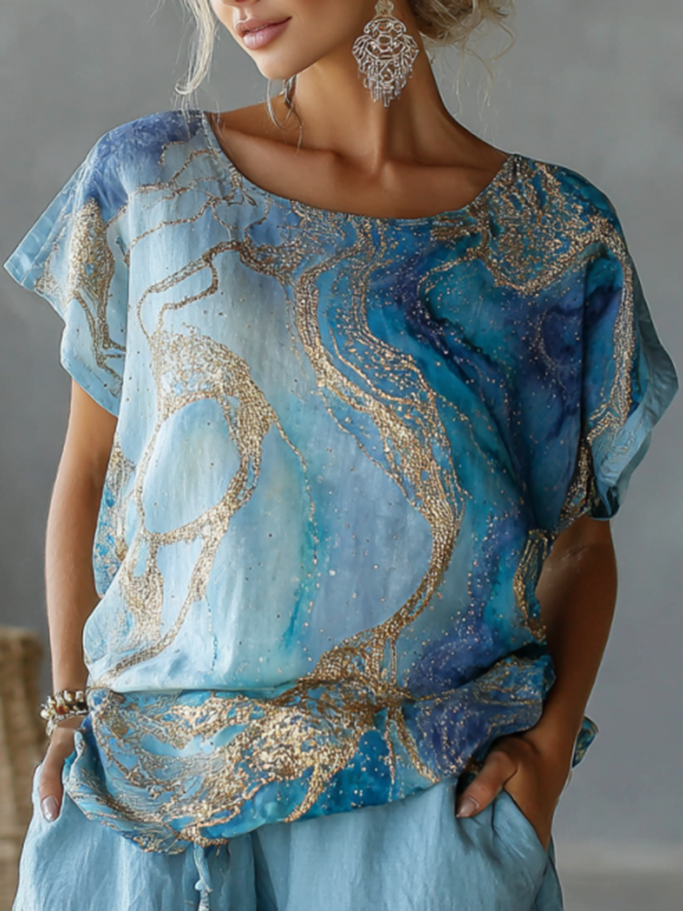Vintage Marble Texture Collection Bohemia Women Style Gradient Black Gilded Pattern Linen Round Neck T-shirt