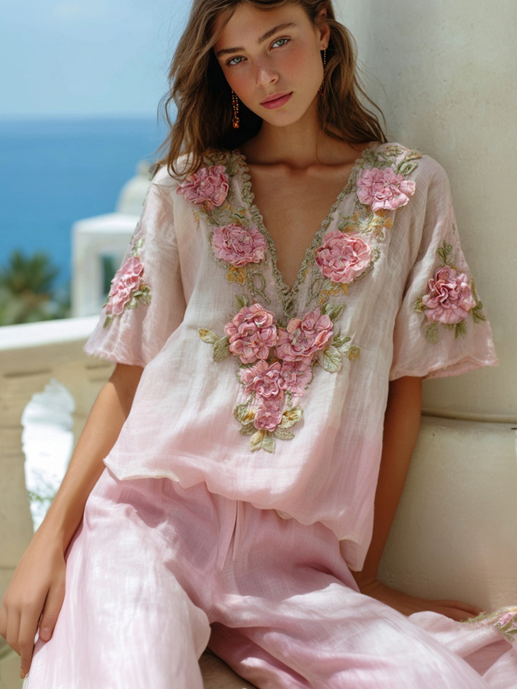 Vintage Pink Rose Embroidered Gradient Linen T Shirt