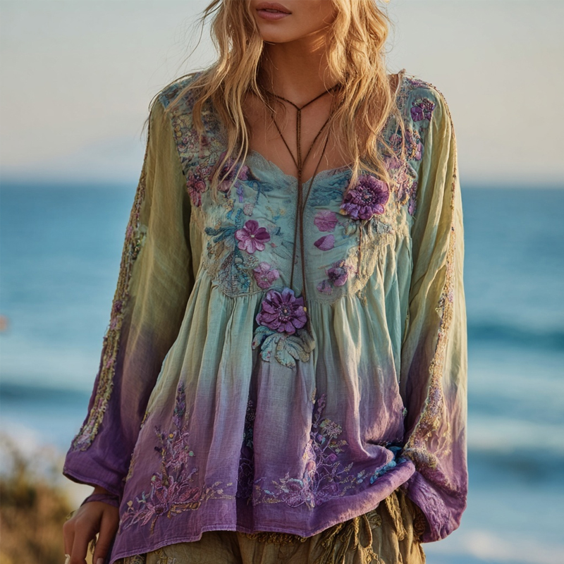 Vintage Purple Flowers Embroidered Gradient Linen Tunic