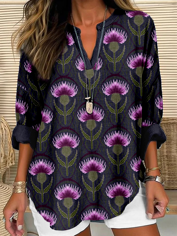 Vintage Scottish Thistle Pattern Linen Blend Cozy Shirt