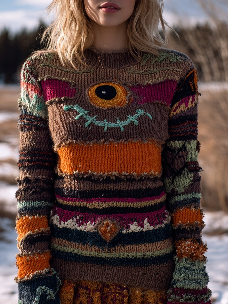 Vintage Spooky Eyeball Striped Patchwork Cozy Knit Sweater
