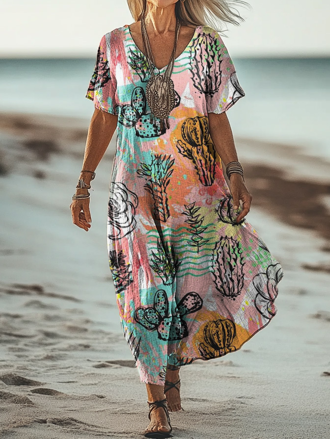 Women's Art Painting Hippie Retro Print V-Neck Short Sleeve Dress