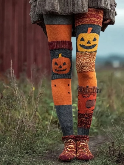 Women's Halloween Pumpkin Face Patchwork Art Leggings