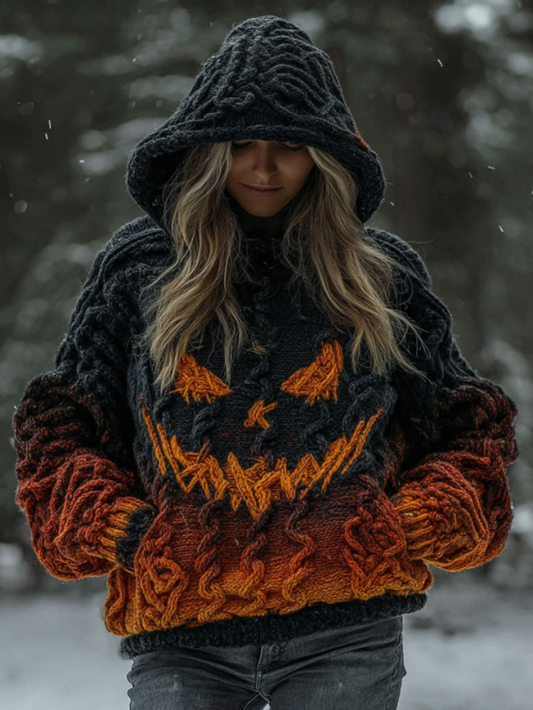 Women's Halloween Spooky Pumpkin Art Gradient Vintage Cozy Knit Hooded Sweater
