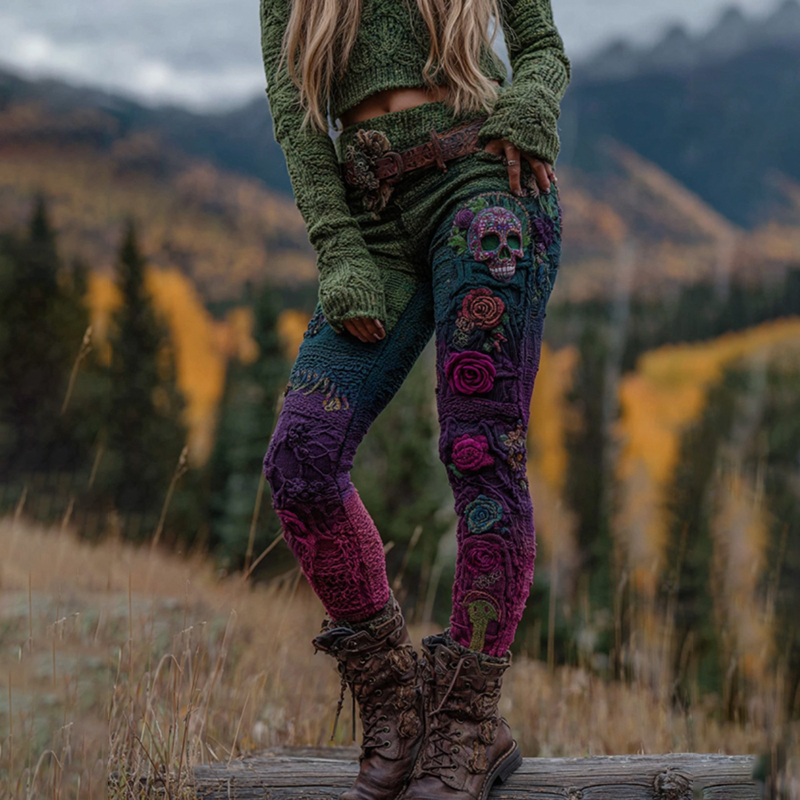 Women's Vintage Viking Skull And Rose Art Knit Leggings