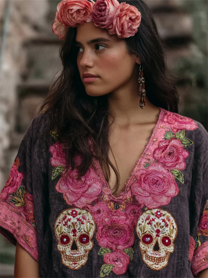 Day Of The Dead Glitter Pink Roses Sugar Skulls Embroidered Linen Shirt