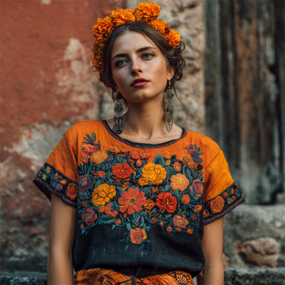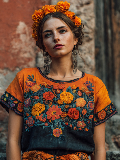 Day Of The Dead Marigolds Floral Embroidered Contrast Linen Shirt