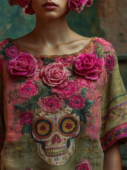 Day Of The Dead Pink Roses Sugar Skull Embroidered Linen Shirt