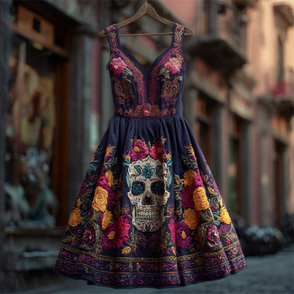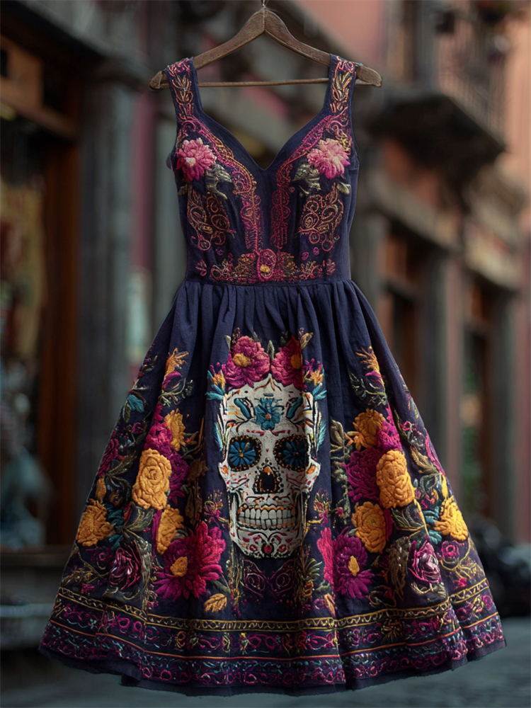 Day Of The Dead Sugar Skull Floral Embroidered Linen Dress