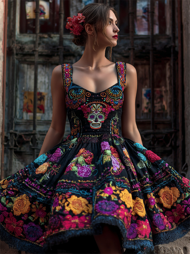 Day Of The Dead Sugar Skull Glitter Floral Embroidered Linen Dress