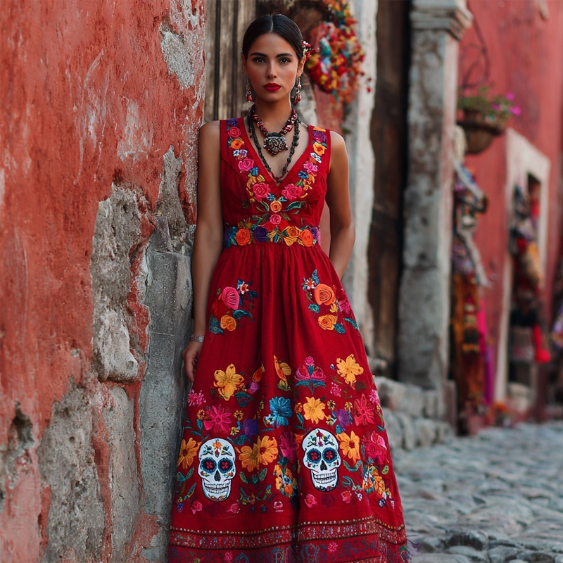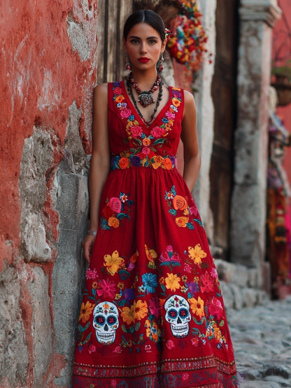 Day Of The Dead Sugar Skulls Flowers Embroidered Linen Maxi Dress