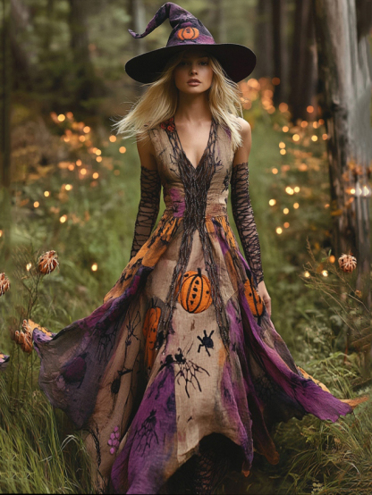 Halloween Themed Tie-dye Ombre Pumpkin Spider Embroidered Beaded Witch Maxi Dress