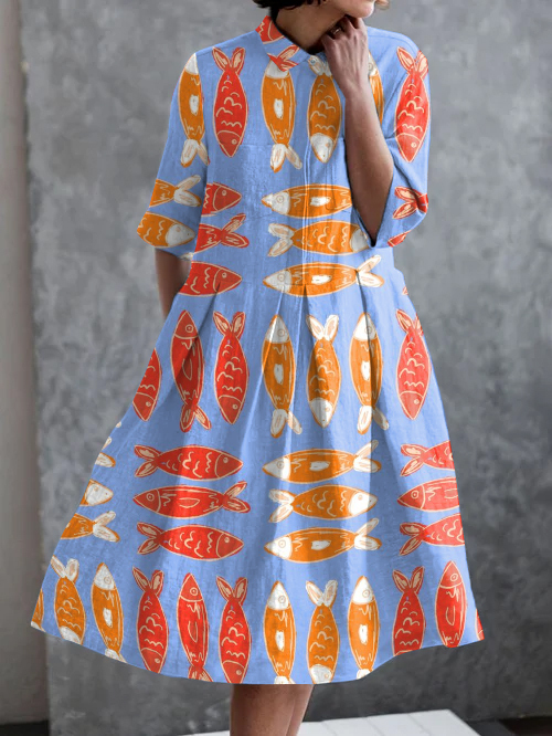Holiday Ocean Fish Print Casual Pocket Half Sleeve Dress