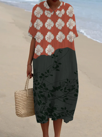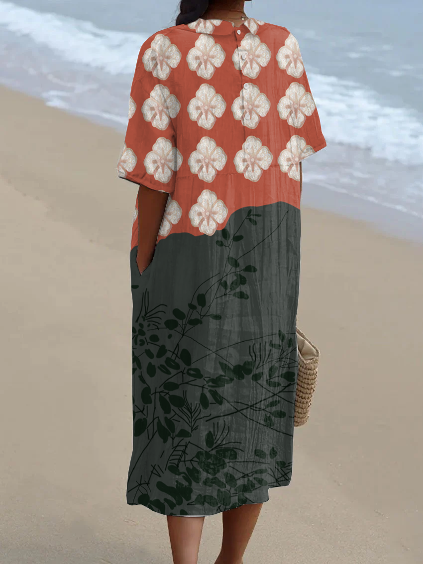 Japanese Floral Print Women's Lapel Pocket Short Sleeve Dress