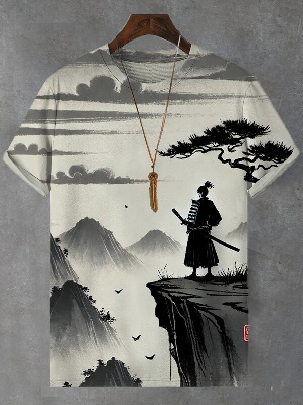 Men's Cliff Scenery Japanese Samurai Ink Painting Print T-Shirt